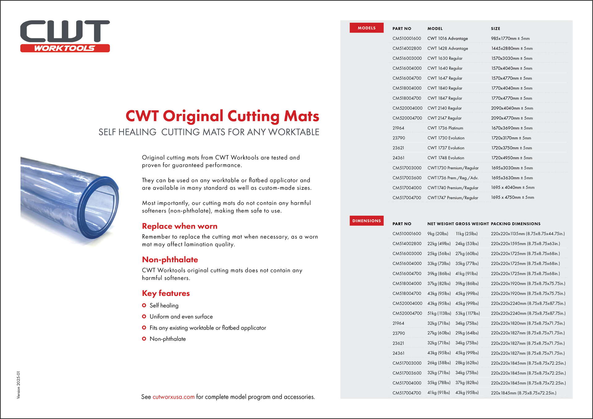 5mm Clear PVC cutting mat designed to fit the CWT 2147 Flatbed Applicator Work Table. Last up to 2 years for cutting on each side. Do not use box blades or the mat will not last!