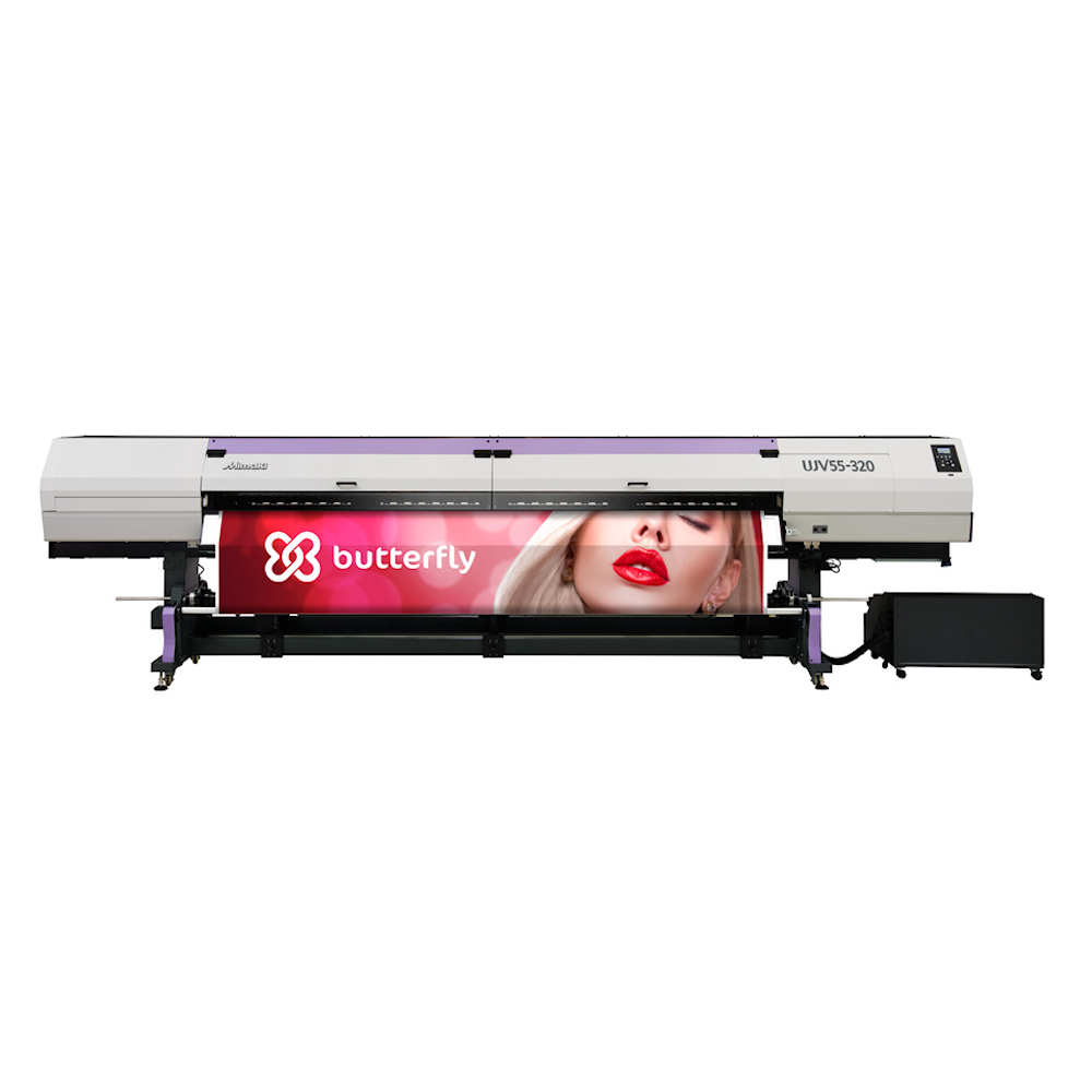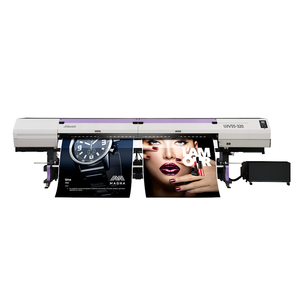 The UJV55-320, 3.2 m-wide LED-UV inkjet printer, offers high cost performance and expands your business.